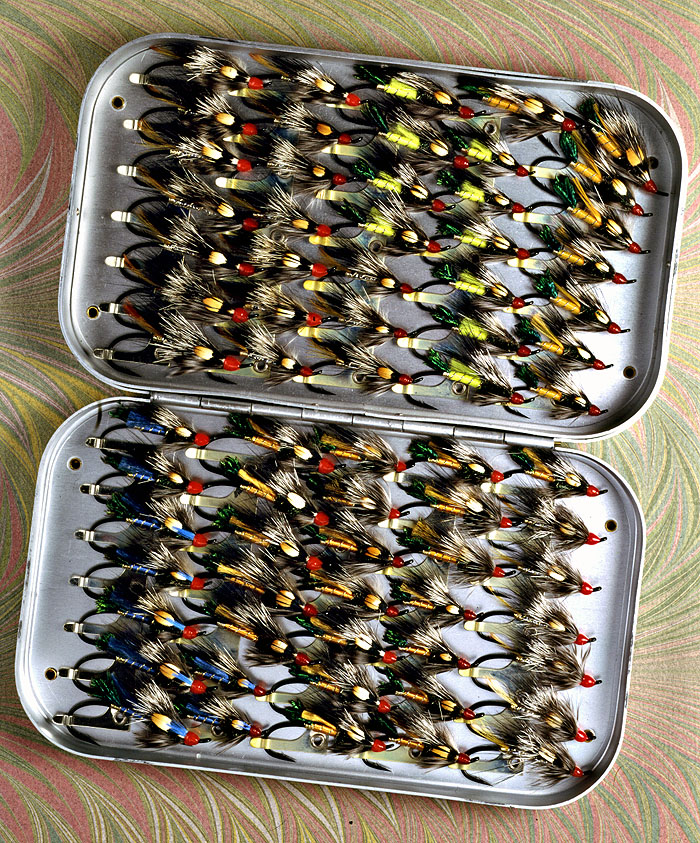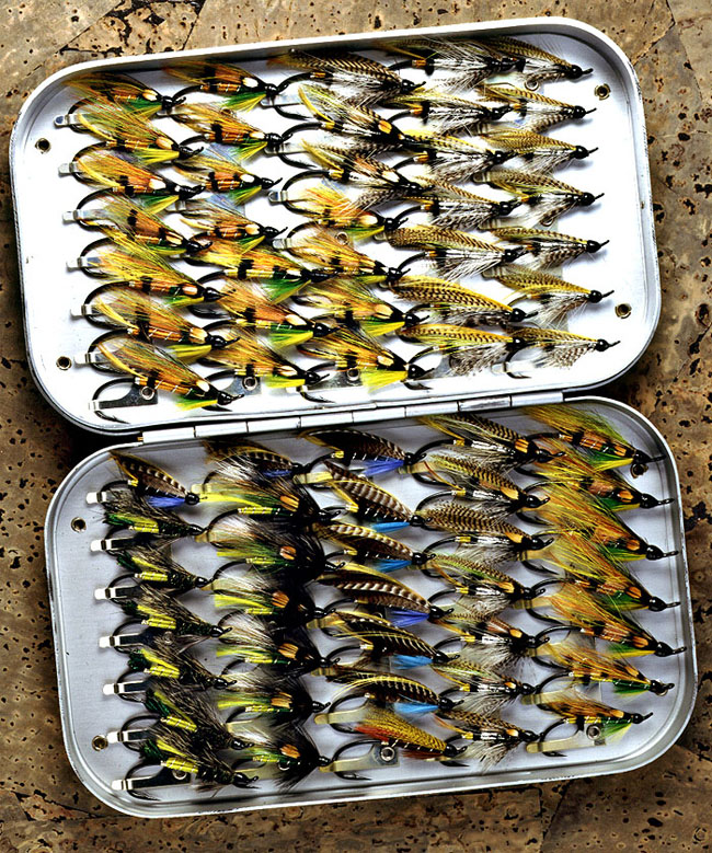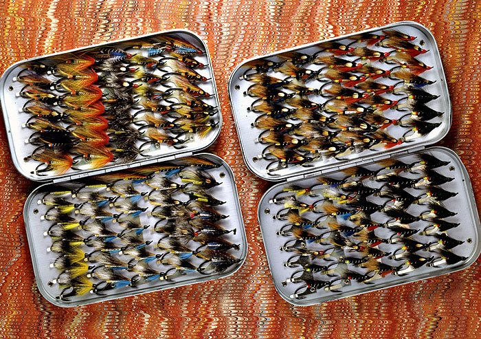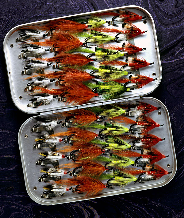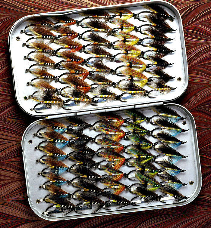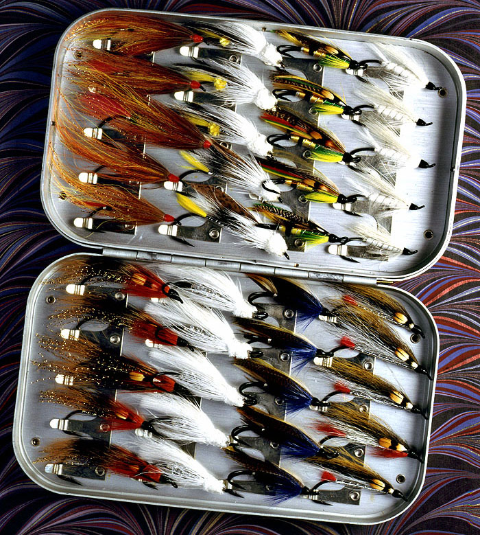 The photographs accompanying this offer on the web site show only a small percentage of the actual collection, both in terms of the number of flies available and the multitude of tiers represented. Serious collectors and lovers of salmon flies are urged to make contact via this web site if they are interested in obtaining some or all of this collection. Please use Email or FAX ONLY 508-898-3379. Private viewings of the collection may be arranged with the consent of the owner at a mutually agreeable location.